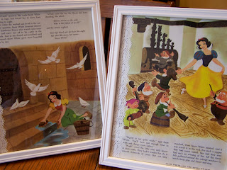 I cut out some full page images with text, bought some cheap white frames, added some paper lace trim to make up for the size difference, and voila!